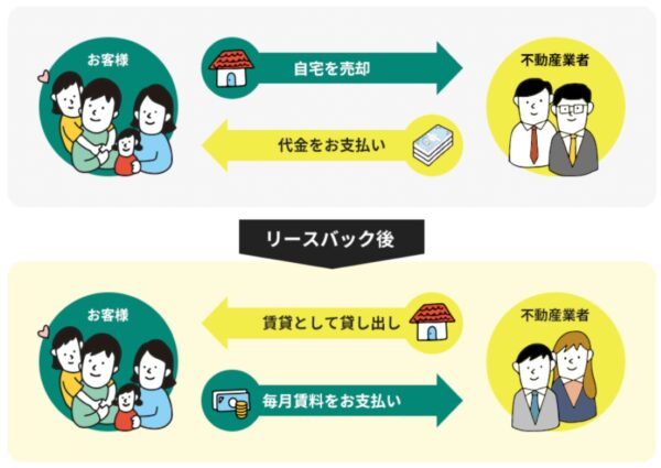 リースバックとは、自宅を不動産会社に売却し、そのまま賃貸借契約を結んで住み続ける仕組みです。